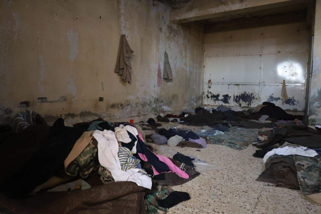 Inside a cell at Sednaya Prison, a pile of clothes and bedding have been left behind by liberated detainees.