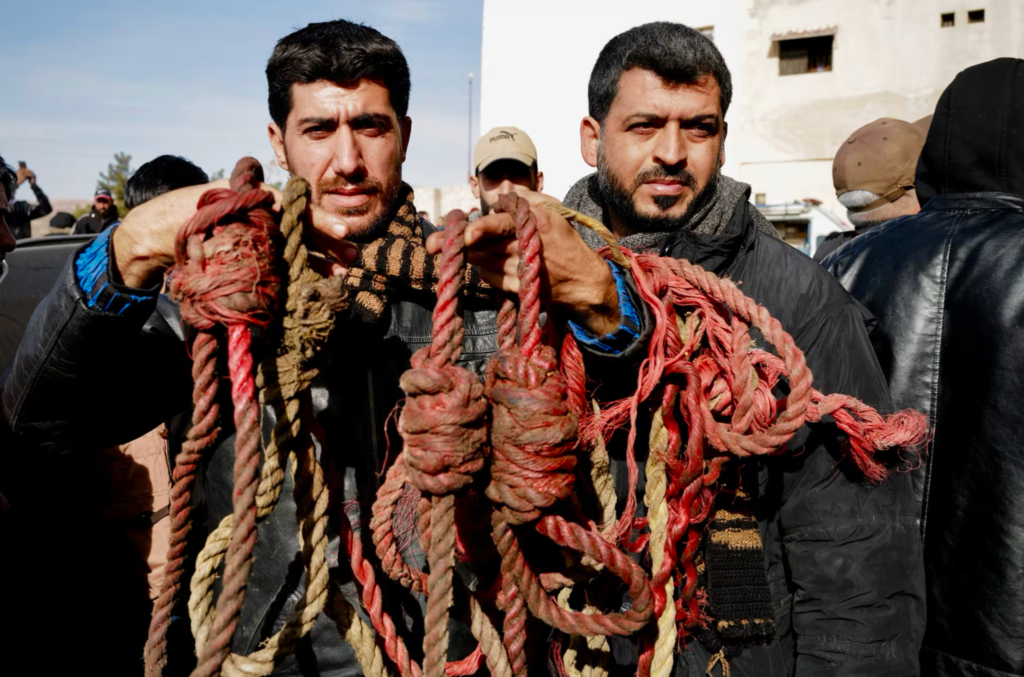 Men hold nooses found at Saydnaya military prison near Damascus on Tuesday.