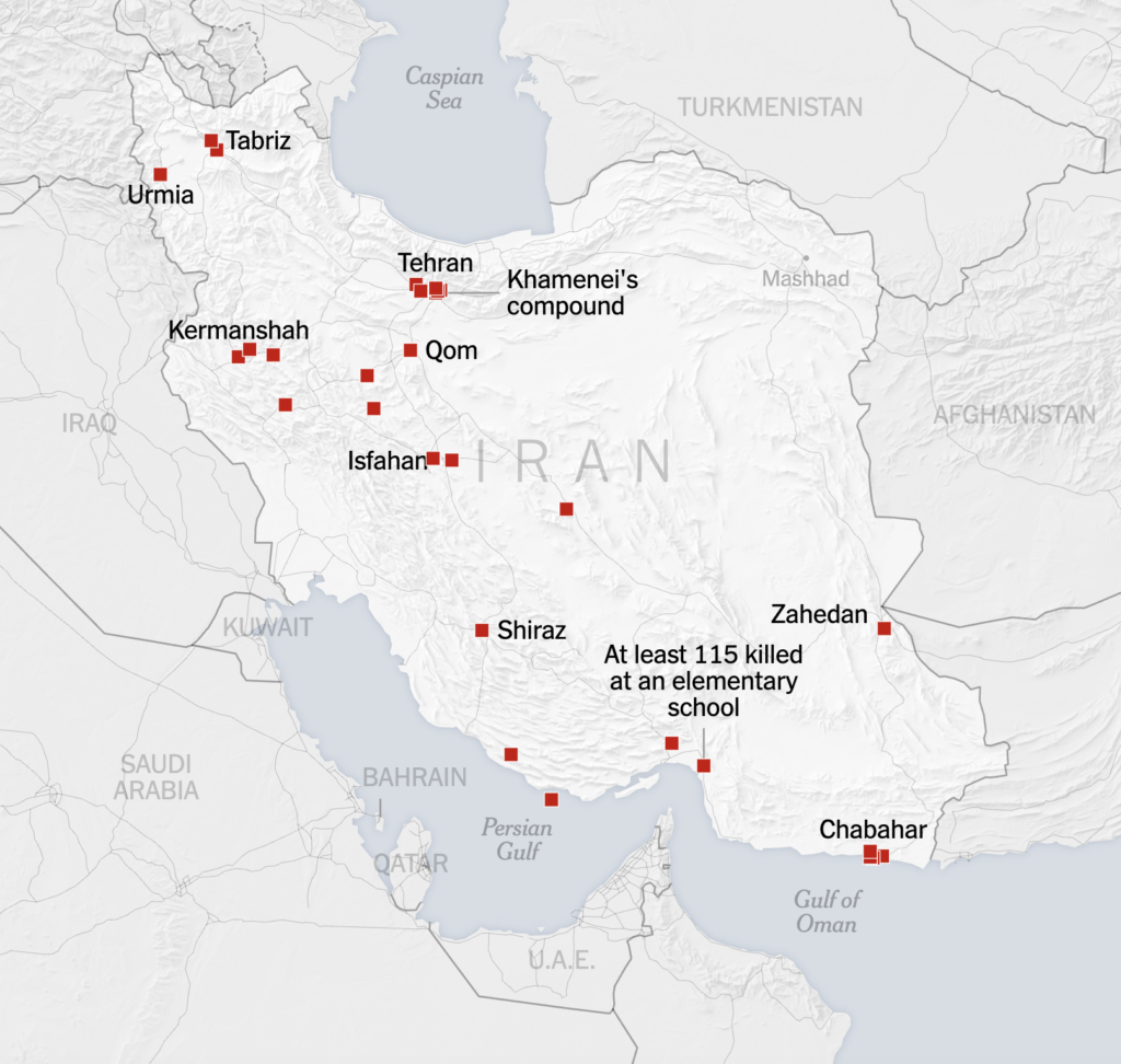 - At least 115 were killed in a strike on Saturday that hit the Shajarah Tayyebeh school, a girls’ elementary school in the southern town of Minab, according to Iranian health officials and state news media. It appears to be one of the worst mass casualty events of the American-Israeli bombing campaign so far. Videos verified by The New York Times show that the school is adjacent to a naval base belonging to Iran’s most powerful military force, the Iranian Revolutionary Guards Corps.